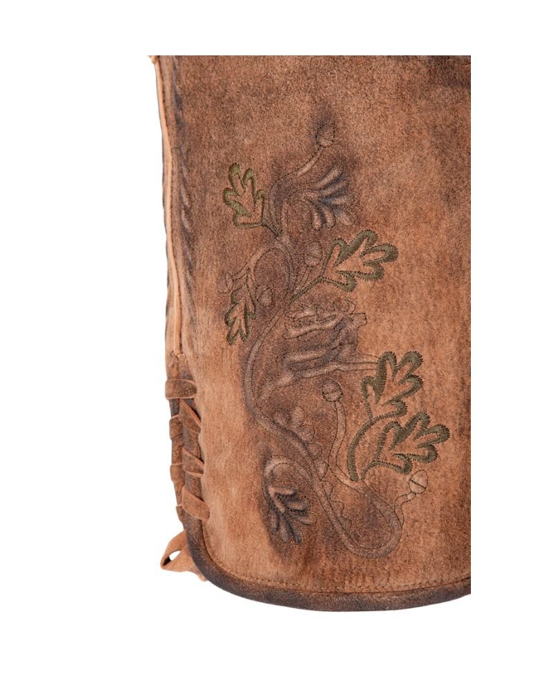 This piece showcases intricate handmade embroidery inspired by Bavarian oakleaf and vine patterns. The design blends tradition with artisan elegance, bringing a touch of cultural pride to your ensemble. Each motif is embossed into the suede with precision, capturing the time-honored aesthetic of authentic Trachten wear.