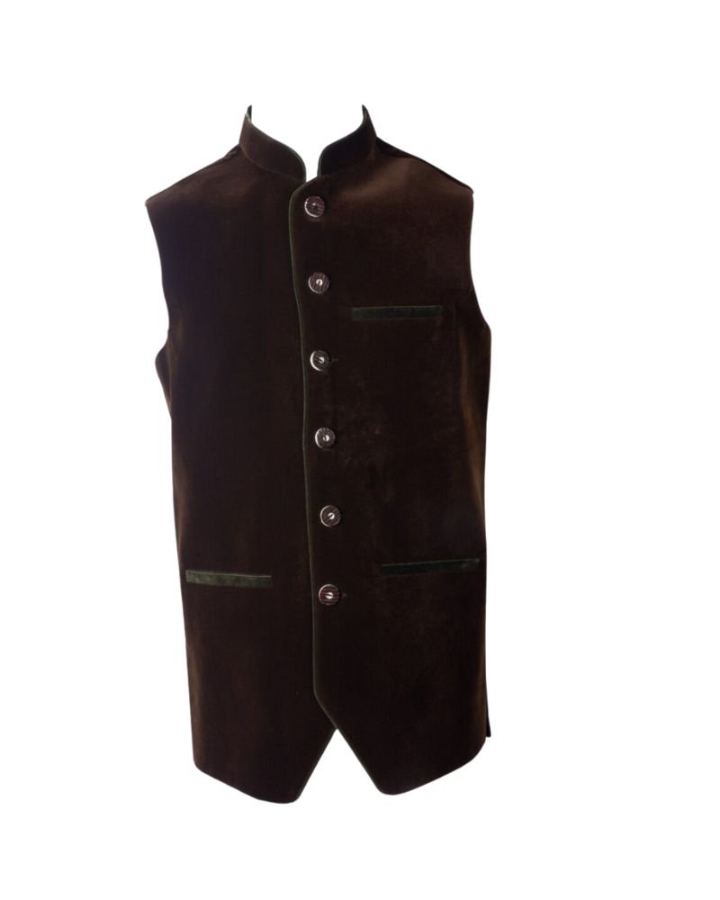 The dark chocolate brown shade pairs beautifully with subtle green piping along the collar and pockets, creating a distinguished Bavarian look. A tailored fit enhances the silhouette, offering both modern style and cultural authenticity. With two side pockets and a chest pocket trimmed in green, this waistcoat combines elegance with functionality.