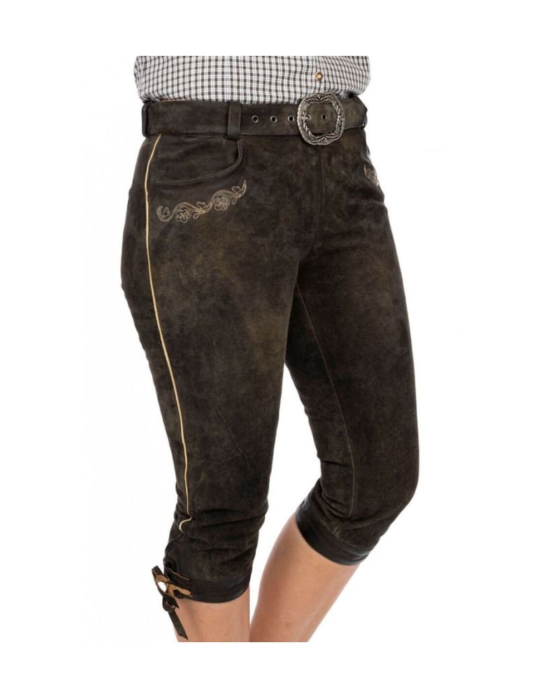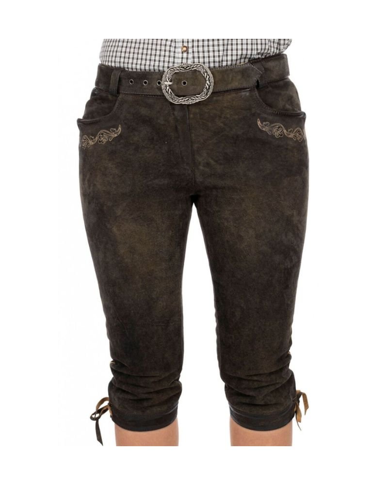 The Berchtesgaden – Mosswood Women’s Bundhosen captures the essence of Alpine tradition in a beautifully earthy color. The mosswood hue—a blend of green and brown—mirrors the forested hillsides of Bavaria, making this pair a natural standout at Oktoberfest, folk festivals, or rustic celebrations. These knee-length leather trousers strike a perfect balance between tradition and femininity.