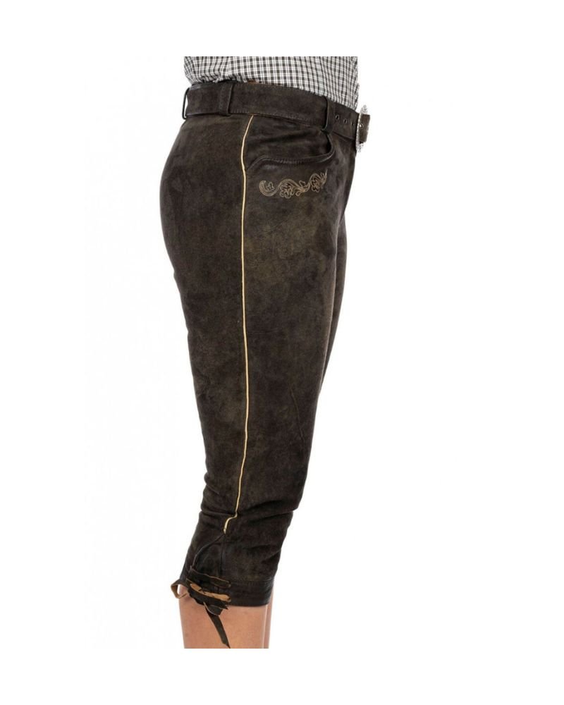 Each pair features exquisite handmade embossed embroidery showcasing traditional Bavarian motifs. The detailed artwork is skillfully applied along the front and sides, adding depth and heritage to the look. Reinforced with naked leather reversible stitching, these trousers hold their shape and finish through many wears—making them as practical as they are beautiful.