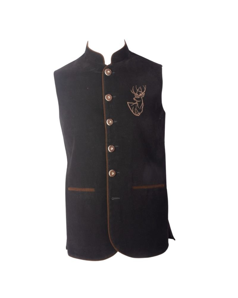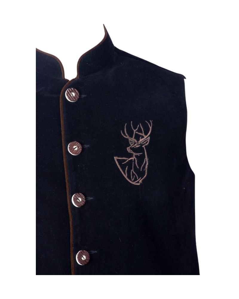 The midnight black base color is enhanced with subtle brown edging, creating a striking yet versatile palette. The stand-up collar contributes to a strong and masculine silhouette, while the embroidered stag motif on the chest adds cultural symbolism and Alpine pride. Two welt pockets trimmed with brown suede offer both function and understated elegance. With its tailored fit, the Greta vest flatters the figure without sacrificing comfort, making it a wardrobe staple for any traditional outfit.