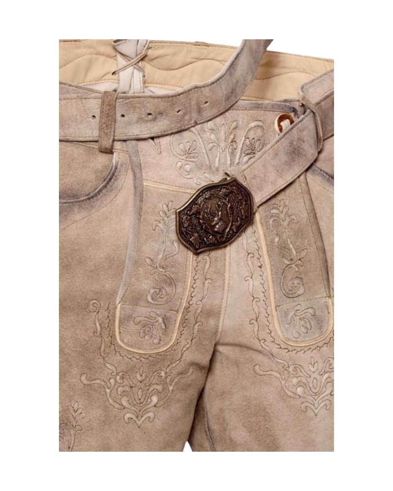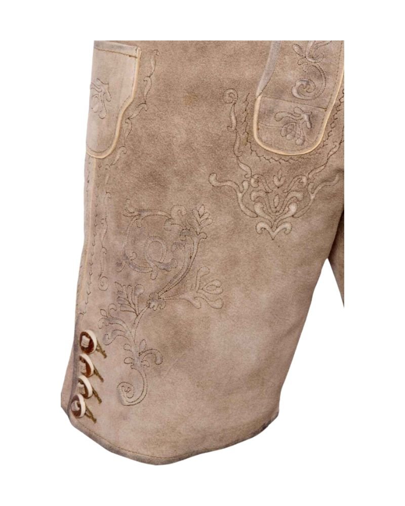 Intricately embossed Bavarian motif embroidery brings cultural authenticity to the forefront. The hand-finished details stand out against the light tan suede, offering a subtle yet striking contrast. Whether you’re dancing in the beer tent or attending a formal Trachten event, this Lederhosen elevates your presence with classic alpine design.