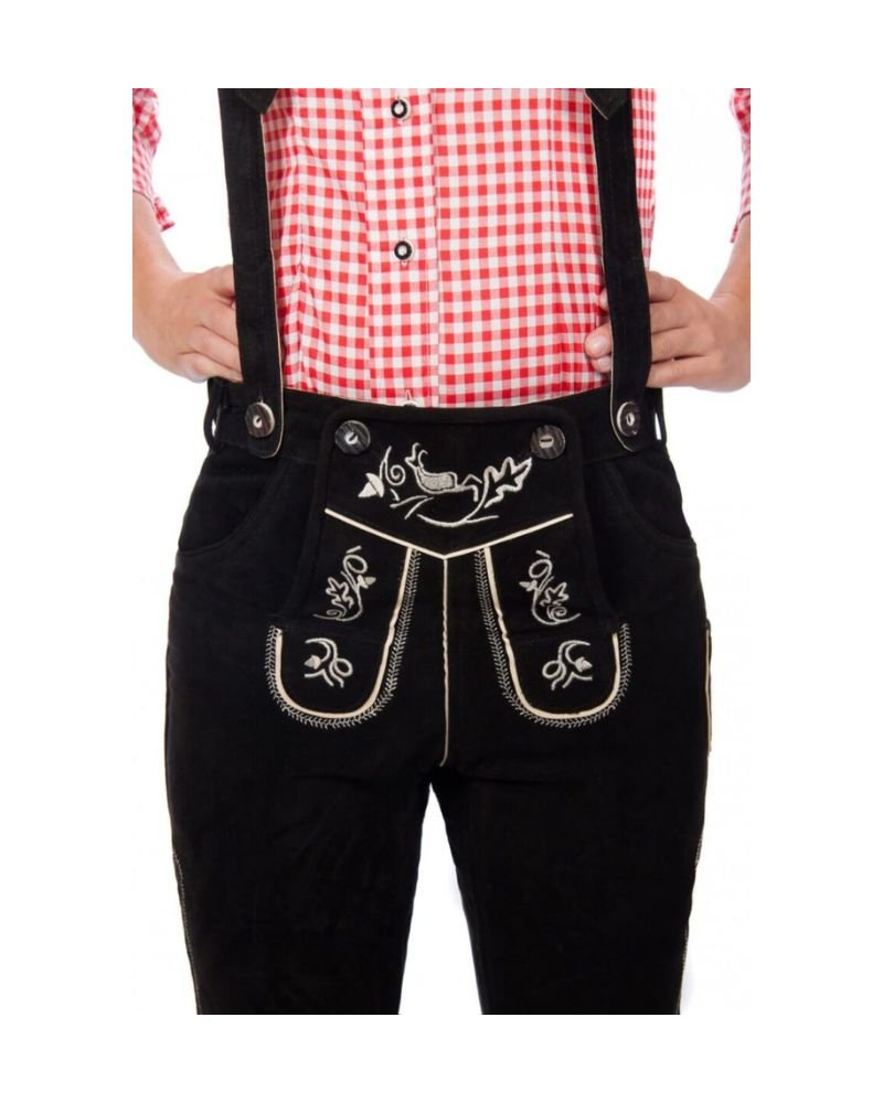 The Isny – Charcoal Night Female Bundhosen offers a modern twist on traditional Bavarian attire. With its deep black leather exterior and bright white embroidery, this knee-length piece blends contrast and class. Ideal for women seeking a timeless look with a refined edge, Isny is more than just a Bundhosen—it’s a fashion statement rooted in heritage.