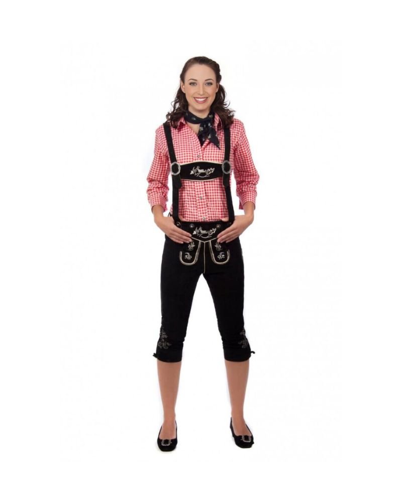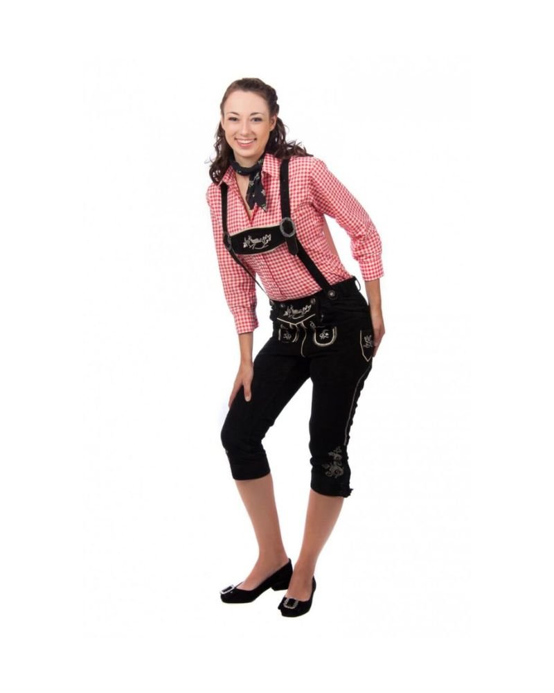Knee-length Bundhosen like Isny are perfect for women who prefer more coverage without sacrificing style. Wear it with a white lace dirndl blouse or a red gingham shirt for a balanced Bavarian outfit. Its dark hue makes it a wardrobe essential, ready to pair with a variety of traditional tops and accessories.