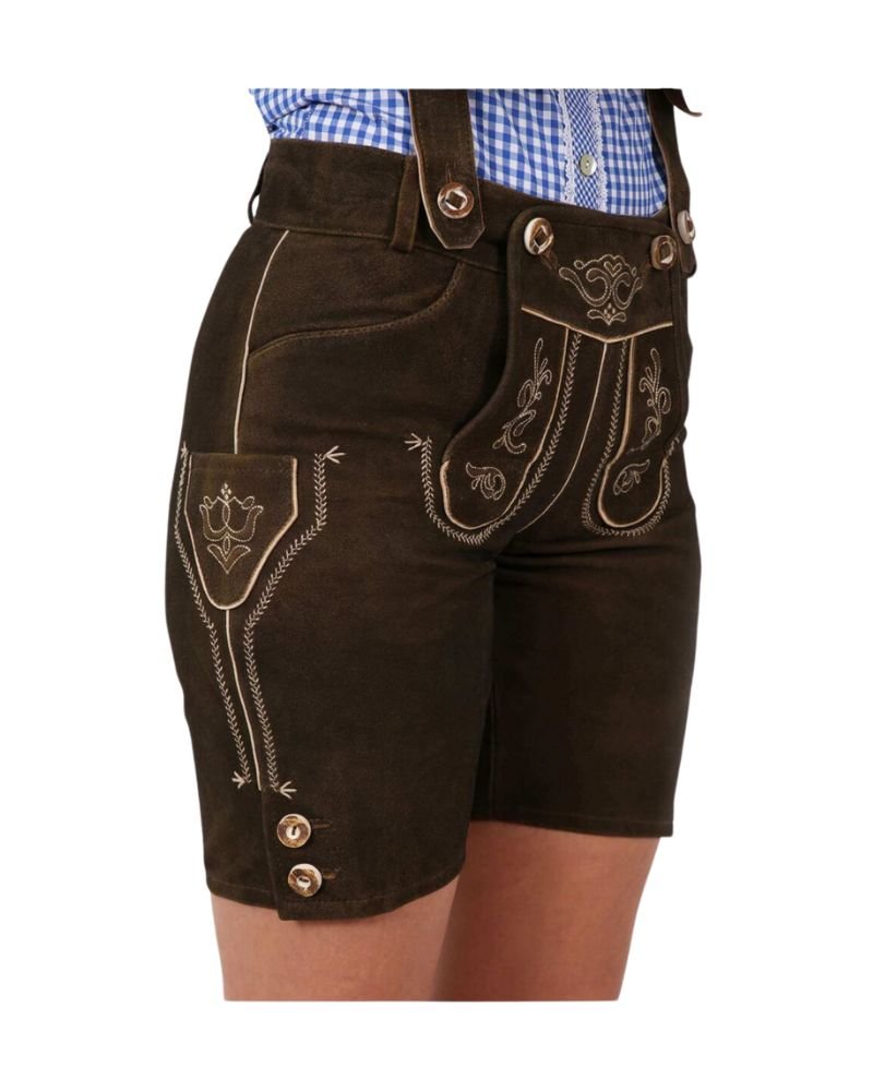 This women’s Lederhosen features delicate white embroidered motifs—carefully hand-embossed into the deep brown suede. These subtle accents reflect authentic German attire traditions while adding a feminine contrast to the rugged leather base. Paired with traditional horn-style buttons and precise stitching, every detail is designed for timeless impact.