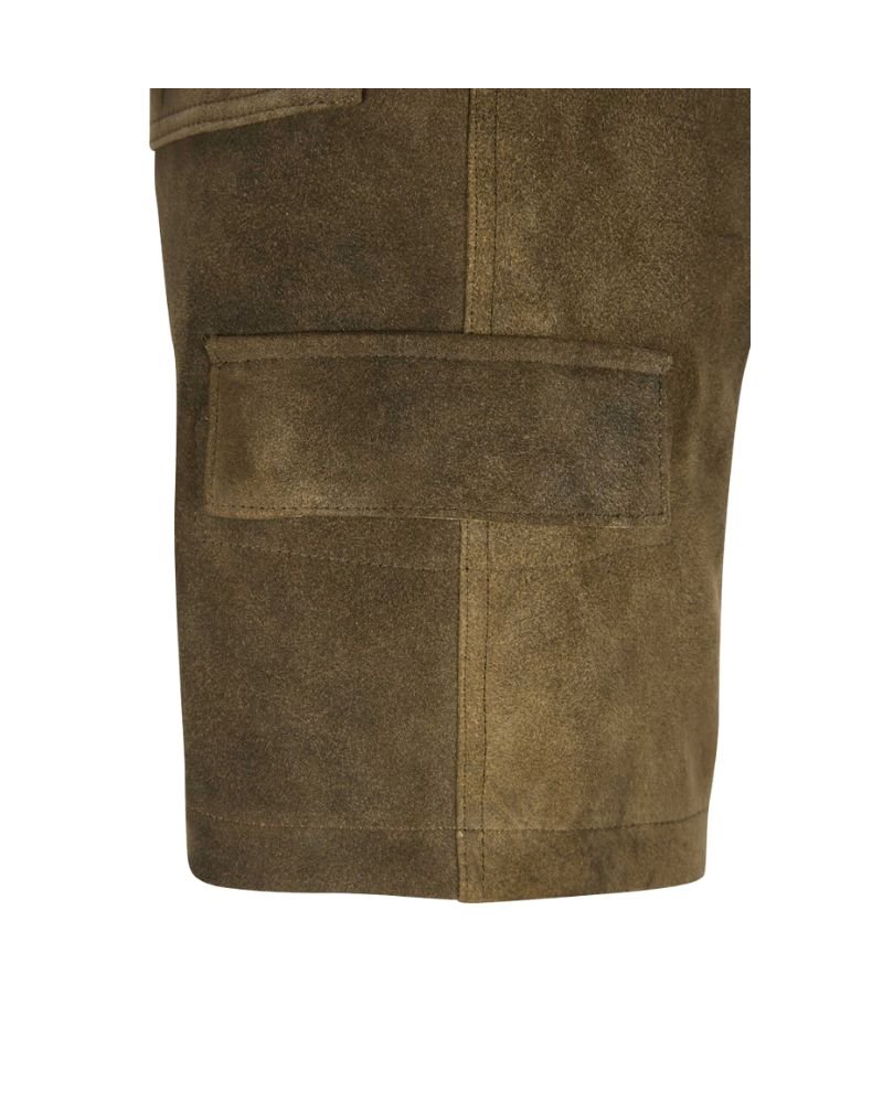 The Emil Foreststone Cargo Lederhosen delivers a fusion of classic craftsmanship and utilitarian design. Crafted in a natural blend of earthy brown and green suede, this knee-length piece offers a grounded, rugged aesthetic fit for both everyday and traditional wear.