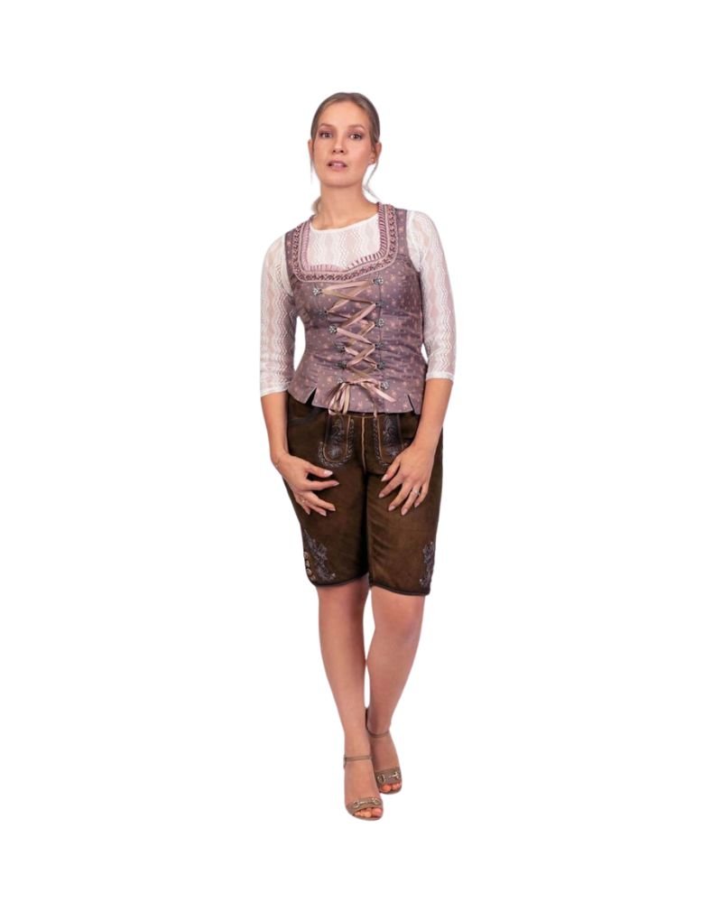 Hand-embossed embroidery showcases traditional patterns inspired by Bavarian heritage. These motifs offer a refined, feminine accent that pairs beautifully with pieces like the Heidi – Rose Pink Women’s Lederhosen or the Anneliese – Slate Women’s Lederhosen for a mix-and-match festival wardrobe. From folk motifs to horn-button details, every stitch honors old-world craftsmanship.
