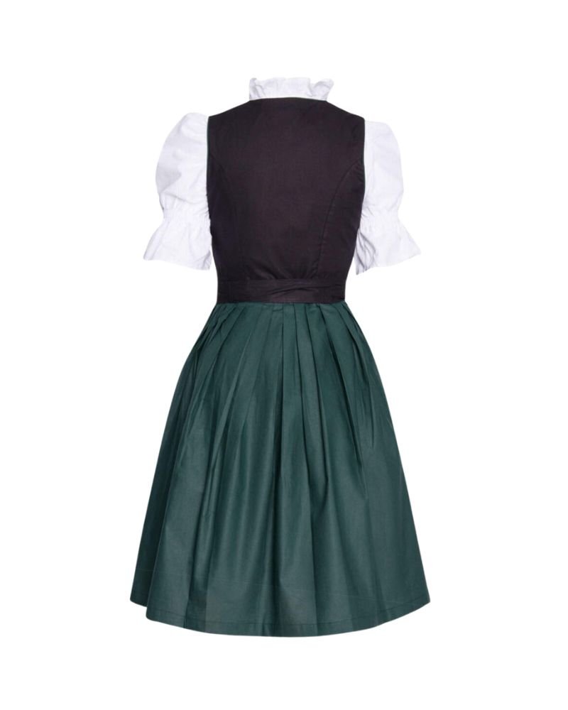 At the heart of the Elena dirndl is its corset-style bodice featuring a blackberry-black base and pine green accents. The decorative ribbon lacing not only creates an hourglass shape but also captures the authenticity of traditional Alpine attire. The black cotton apron contrasts elegantly against the skirt, tied with a bow that completes the classic look. Together, these elements highlight timeless dirndl craftsmanship that speaks to both culture and sophistication.