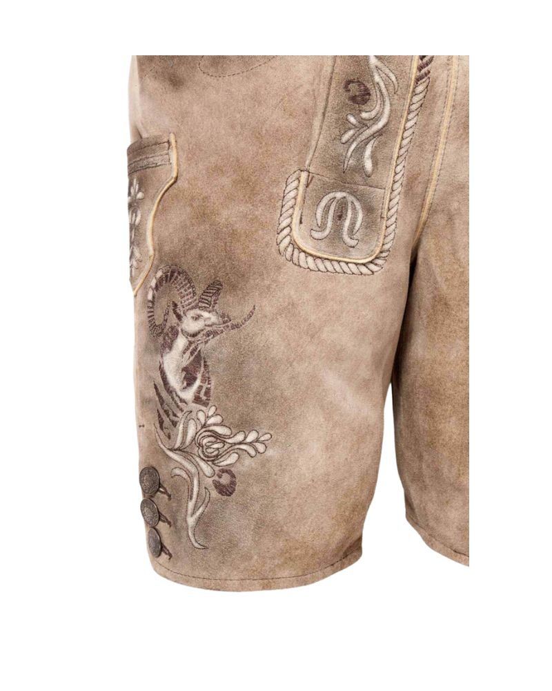 Crafted for the modern wearer with a love for tradition, these Lukas Rustic Ibex Embroidered Shorts reflect time-honored Bavarian heritage through every stitch. The soft yet rugged goat suede leather delivers both durability and breathability, while the light beige-brown finish creates a rustic, lived-in appeal. Whether you’re heading to a cultural fest or styling a statement look, these shorts bring an unmistakable German identity.