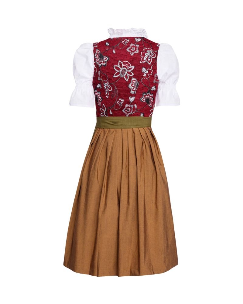 This olive and rust red dirndl blends earthy Bavarian tones with decorative floral accents, giving you a festive look that stands out in a beer tent or during a village celebration. Style it with a pearl choker, ankle boots, or flats to complete a charming Oktoberfest outfit that turns heads.