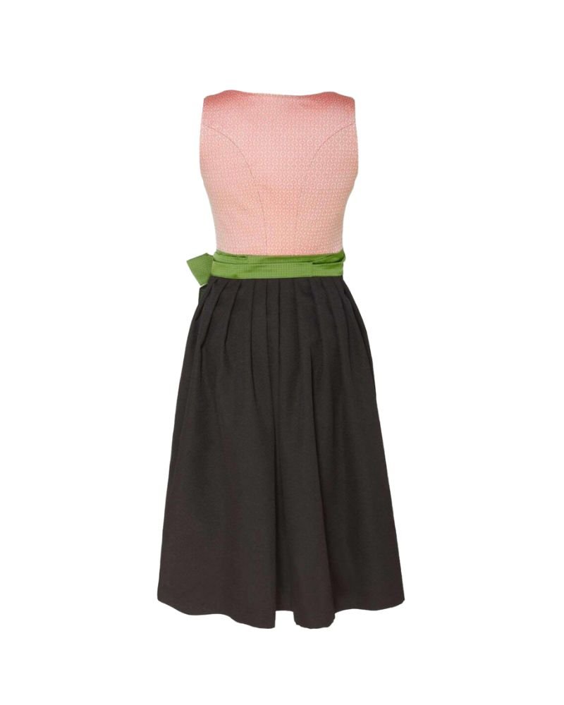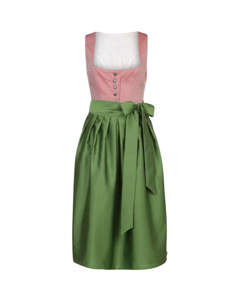 • Vintage-inspired dirndl in rose pink with moss green apron and classic long length