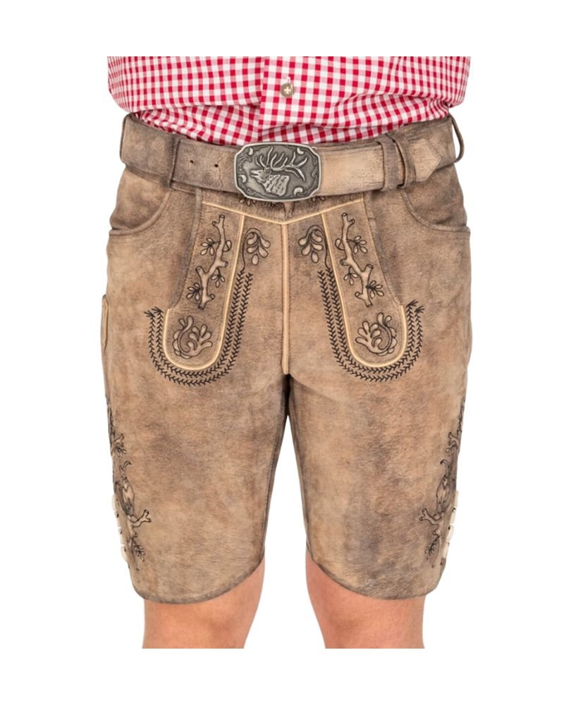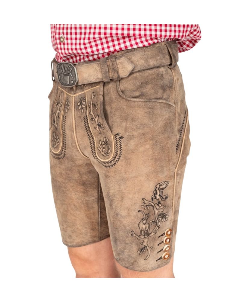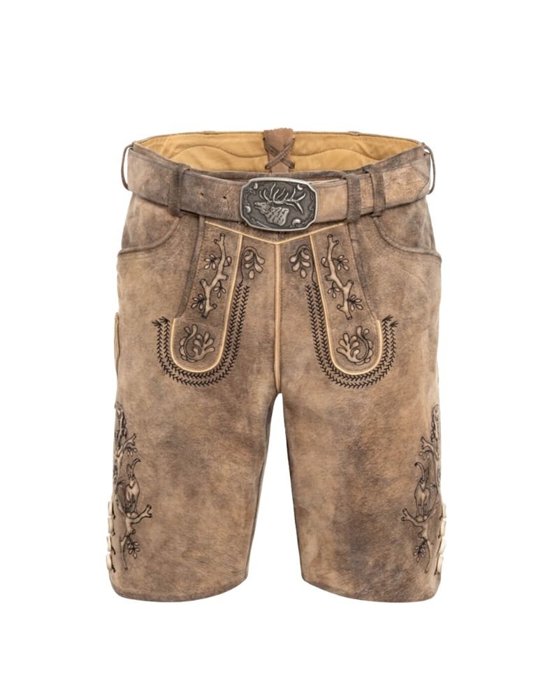 Intricate vine embroidery and a regal stag motif set this Lederhosen apart. The detailing is precision-handcrafted, evoking a sense of regional pride and sophistication. The embroidery threads complement the suede’s natural texture, while the decorative stag-head buckle enhances the garment’s traditional appeal. It’s a design that makes a statement without overwhelming.