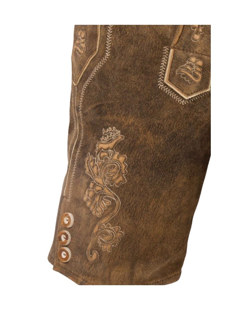 Each pair features embossed Bavarian embroidery—delicate patterns of vines, florals, and folk-inspired motifs handcrafted onto the flap and legs. These details honor the heritage of Passau and its place in Trachten tradition. If you appreciate fine stitchwork and bold, rustic hues, consider browsing similar pieces like the Oliver Edelweiss Fawn Lederhosen, known for its light-toned finesse and intricate patterning.