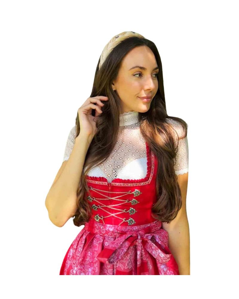Every part of the Maria dirndl radiates in ruby red—from the dress to the apron. This monochromatic aesthetic adds a strong visual impact, while the floral pattern on the apron keeps it delicately feminine. The color story is bold yet cohesive, designed for the woman who wants to stand out gracefully in a sea of neutrals.