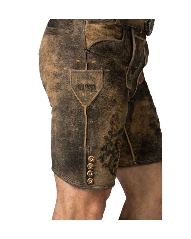 The Rustic Oakleaf Embroidered Lederhosen combines traditional aesthetics with rugged durability. Cut from premium goat suede leather, these leather shorts deliver a naturally aged, rustic brown tone that captures the soul of authentic Alpine wear. The intricate embroidery showcases Bavarian oak leaves and deer motifs—timeless emblems that echo heritage and wilderness. With every detail handcrafted, this piece speaks directly to those who appreciate quality and cultural legacy.