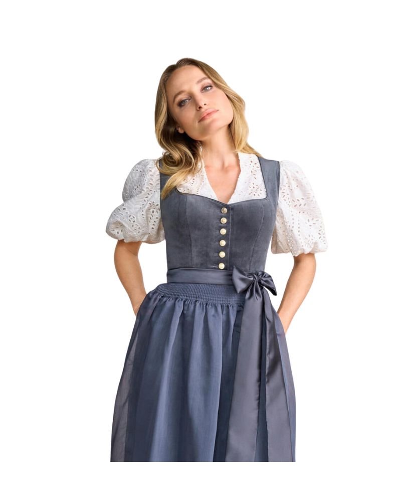 This storm-toned dirndl dress is constructed with a premium blend of velvet, cotton, and polyester, offering both comfort and style. The midi length creates a flattering silhouette that’s ideal for various occasions—from Oktoberfest tents to traditional weddings. Its subtle sheen and beautifully draped apron elevate the entire ensemble, while the fitted bodice enhances the figure without compromising comfort.