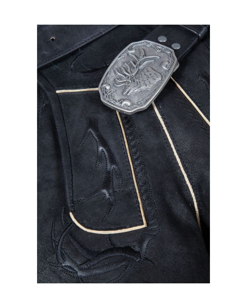 Delicate embossed embroidery brings to life traditional Bavarian patterns—think oak leaves, scrolls, and heritage symbols. These detailed flourishes are carefully hand-applied, lending this lederhosen a refined elegance rooted in Alpine artistry. The obsidian shade enhances every curve of the embroidery, creating a visually rich piece.