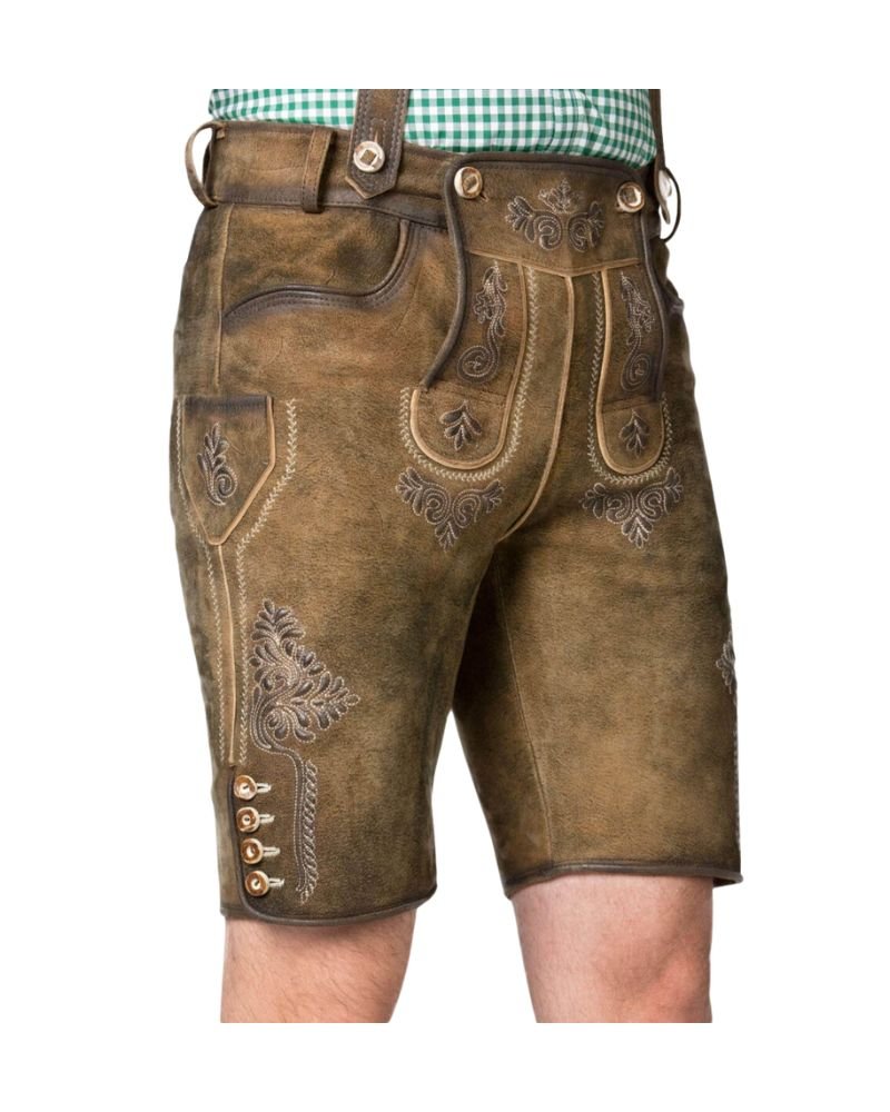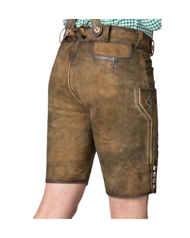 The lederhosen feature a unique reversible stitching technique with naked leather, which not only enhances the durability of the stitching but also adds a subtle design element that reflects the high-quality craftsmanship.